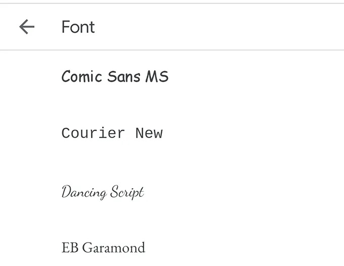 You can change fonts in your documents on the Google Docs app for Android and iOS as well. This app lists all available fonts on a single screen for you to pick from.
