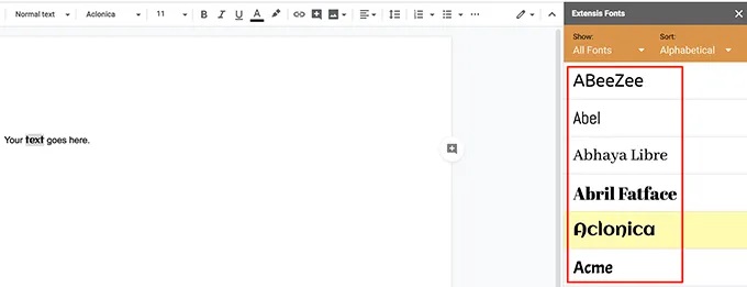 Unlike the default Google Docs fonts, you can’t pick a font from the Extensis Fonts add-on and start typing. You must have some text in your document already, and then you can use a font from that add-on to format your text.