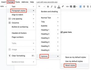 - You can reset your font preferences by clicking Format > Paragraph styles > Options > Reset styles. You then need to save your reset style as the default like you did above.