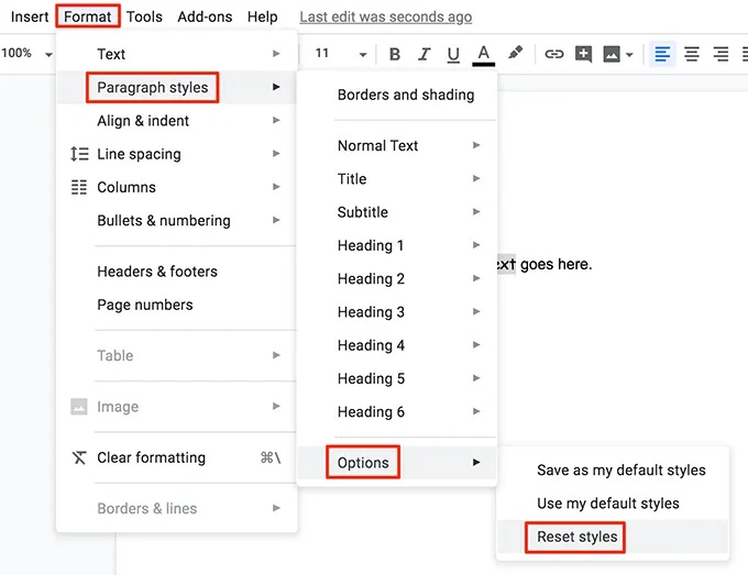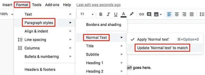 - Click the Format menu at the top, select Paragraph styles, click Normal Text, and choose Update ‘Normal text’ to match.
