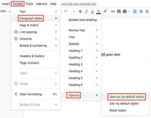 - Make sure your text is still selected. Click the Format menu, select Paragraph styles, click Options, and choose Save as my default styles.