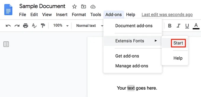 - Click the Add-ons menu at the top and select Extensis Fonts followed by Start.