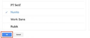 - Once you find the font you like, click the font and it’ll be added to your fonts list. Then click OK at the bottom to close the fonts window.